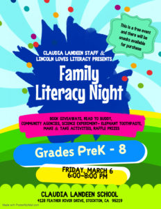 fri06mar6:00 pm8:00 pmFAMILY LITERACY NIGHTOpen to the Community6:00 pm - 8:00 pm Claudia Landeen School, 4128 Feather River Dr, Stockton, CA 95219 Event Organized By: Claudia Landeen School